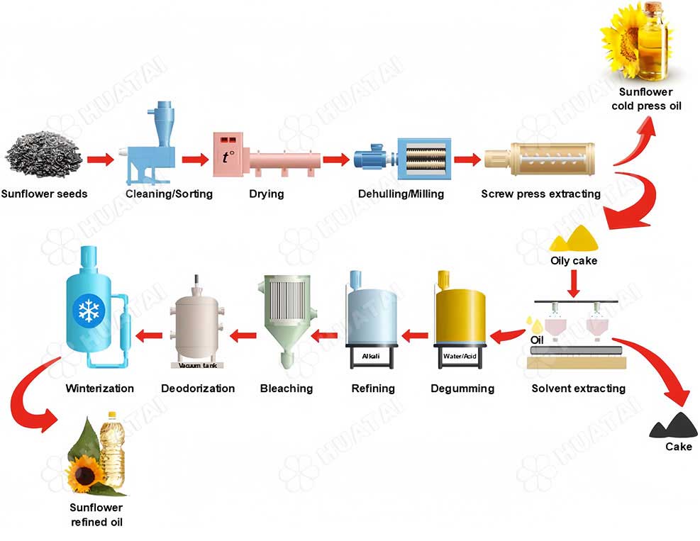 Huatai complete sunflower oil production line with 10-5000TPD Capacity can be customized for design, manufacturing, installation and debugging. Huatai sunflower oil production line adopts advanced technology, from sunflower seed cleaning, pressing/extraction to refining (degumming, deacidification, decolorization, deodorization).